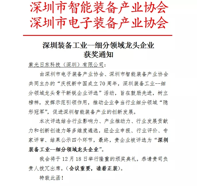 2019年12月18日,由深圳市電子裝備產業(yè)協(xié)會、深圳市智能裝備產業(yè)協(xié)會主辦的“深圳裝備工業(yè)—細分領域龍頭骨干新銳企業(yè)”評選活動,在深圳市福田區(qū)會展中心舉行盛大的頒獎典禮,經過組委會的層層篩選,日東科技在本次評選中獲得了細分領域”龍頭企業(yè)“的殊榮!
