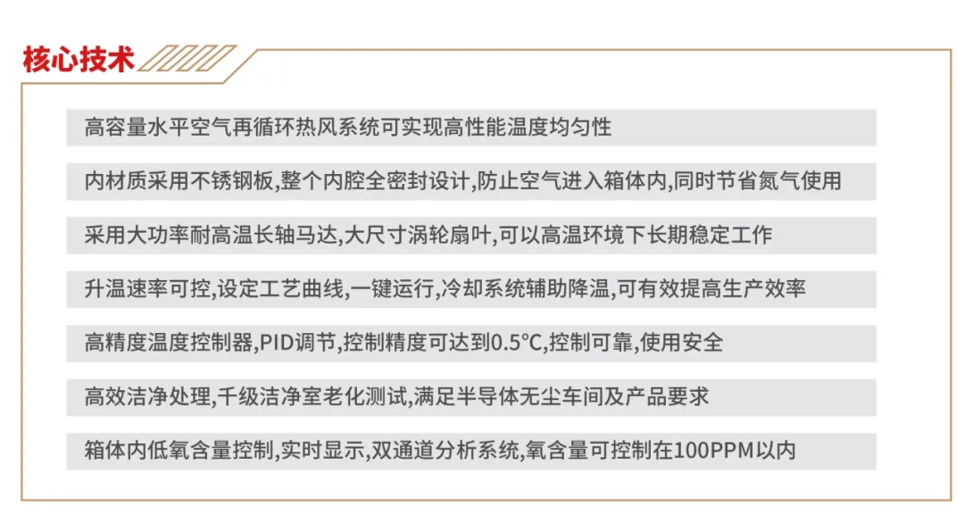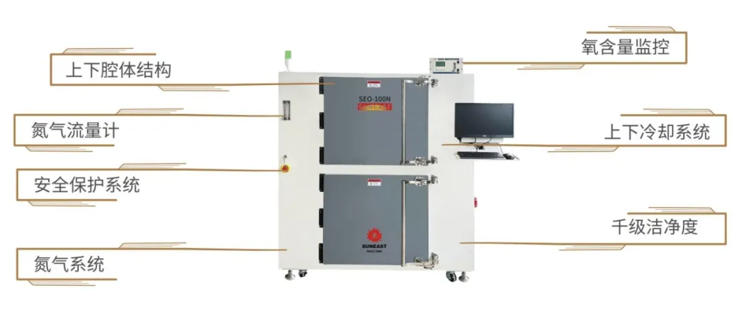 日東科技SEO系列半導體充氮烤箱通用性強,通過充入氮氣將烤箱中的氧氣排出,防止烘烤高溫產生氧化現象。設備采用高容量水平空氣再循環系統,采用專有的腔室結構和密封技術,具有出色的氣密性和溫度均勻性,滿足半導體產品高性能要求,適用于固化半導體晶圓、IC封裝(銅基板,銀膠,硅膠,環氧樹脂)、玻璃基板等產品烘烤。