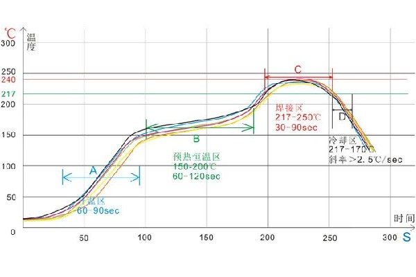 焊接區:焊接區的溫度從217度到260度,升溫斜率應在2度/秒,升溫時間60~90秒;