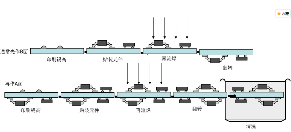 B,雙面貼裝:A面預(yù)涂錫膏→貼片(分為手藝貼裝和機器主動貼裝)→回流焊→B面預(yù)涂錫膏→貼片(分為手藝貼裝和機器主動貼裝)→回流焊→查看及電測驗。