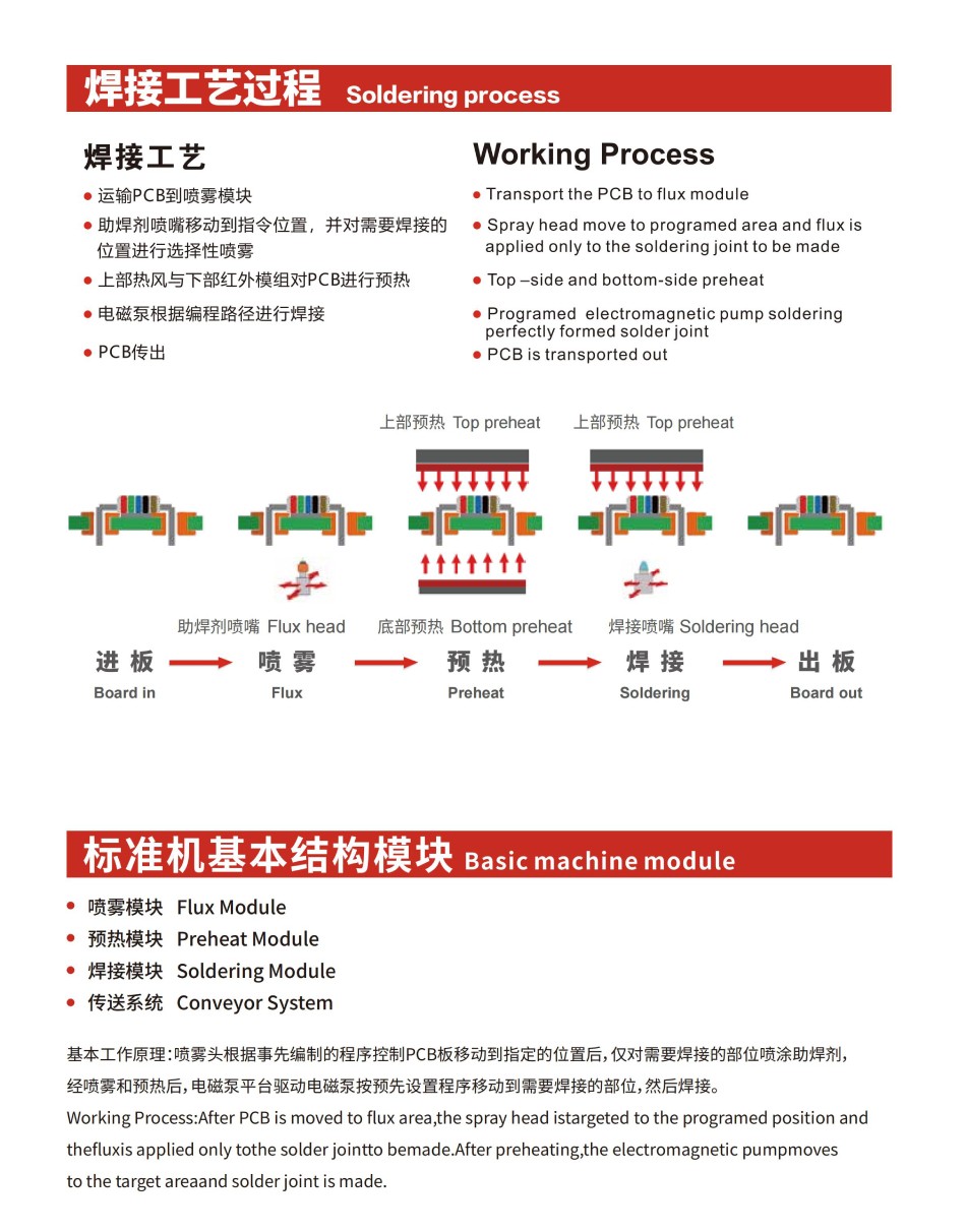 基本工作原理:噴霧頭根據事先編制的程序控制PCB板移動到指定的位置后, 僅對需要焊接的部位噴涂助焊劑,經噴霧和預熱后,電磁泵平臺驅動電磁泵按預先設置程序移動到需要焊接的部位,然后焊接。
